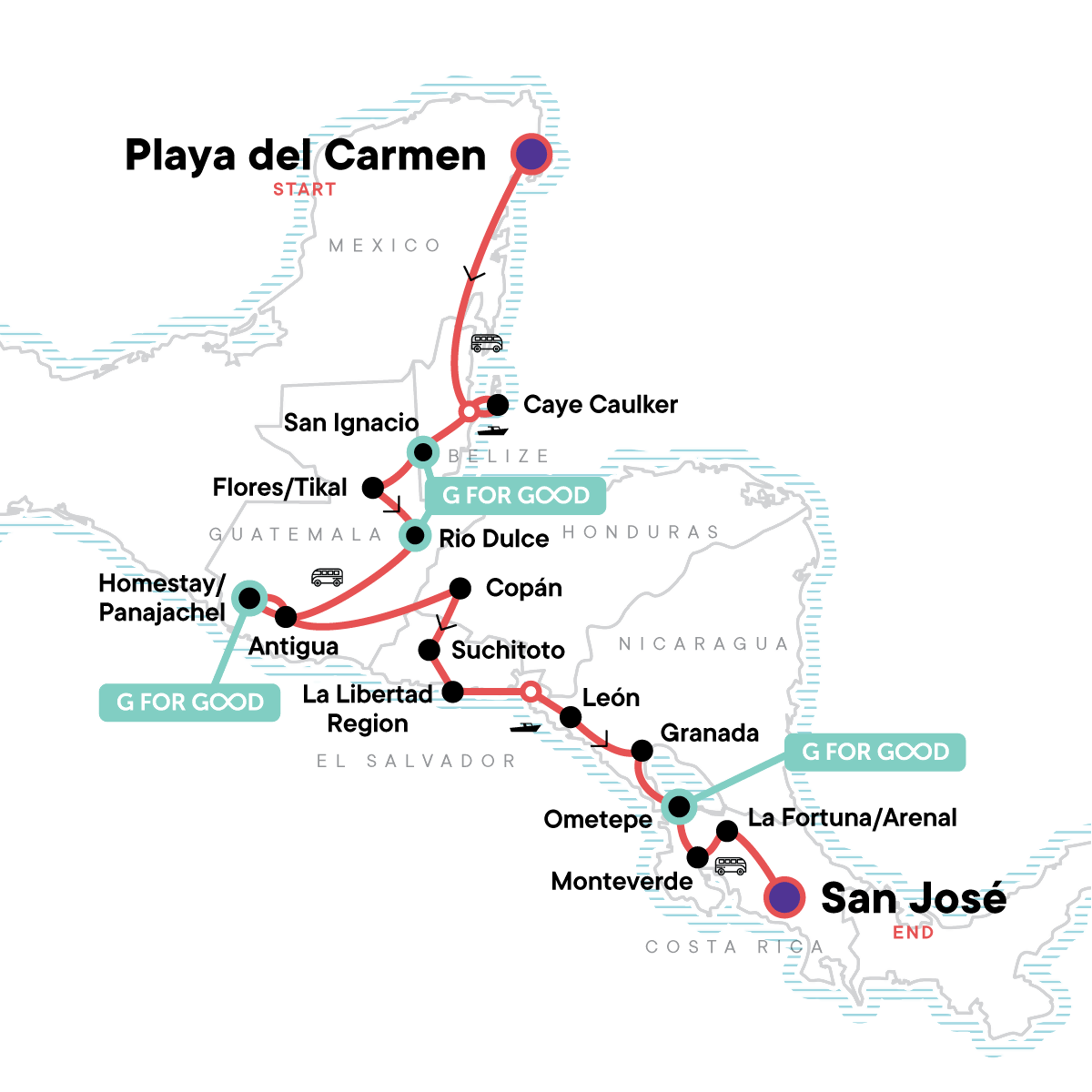 Are you looking for the maximum Central American adventure at minimum cost? Try this 32-day trip on for size and visit seven different countries, filling your days with Mayan ruins, clear Caribbean waters, lush rainforests, and Pacific waves. With ample free time to choose your own activities in some iconic destinations between Mexico and Costa Rica, there’s no limit to the epic experiences. Explore indigenous Mayan villages and meet locals for an immersion into the authenticity of Central America!