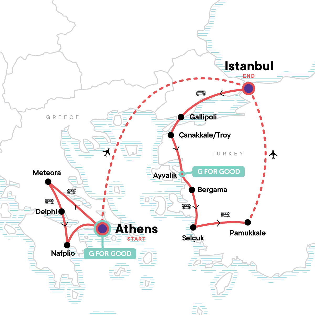 Your Foodie Moment: Cooking Class Athens, Athens. Athens orientation walk. Guided tour of the Acropolis and Parthenon. Acropolis and Parthenon entrance fees. Visit the site of Thermopylae Information Center. Guided tour of Ancient Delphi. Visit the Corinth Canal. International flight from Athens to Istanbul. Gallipoli battlefields entrance and guided visit. Troy entrance and guided visit. Ephesus entrance and visit. Ancient Hierapolis and Pamukkale entrance and guided walk. Istanbul city walking tour. Internal flight from Pamukkale to Istanbul. All transport between destinations and to/from included activities.