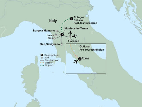 Your tour opens in the famous spa resort town of Montecatini Terme, nestled in the heart of the rolling hills of Tuscany. This evening, get to know your fellow travelers during a welcome dinner where regional foods and Italian wines kick off your adventure.