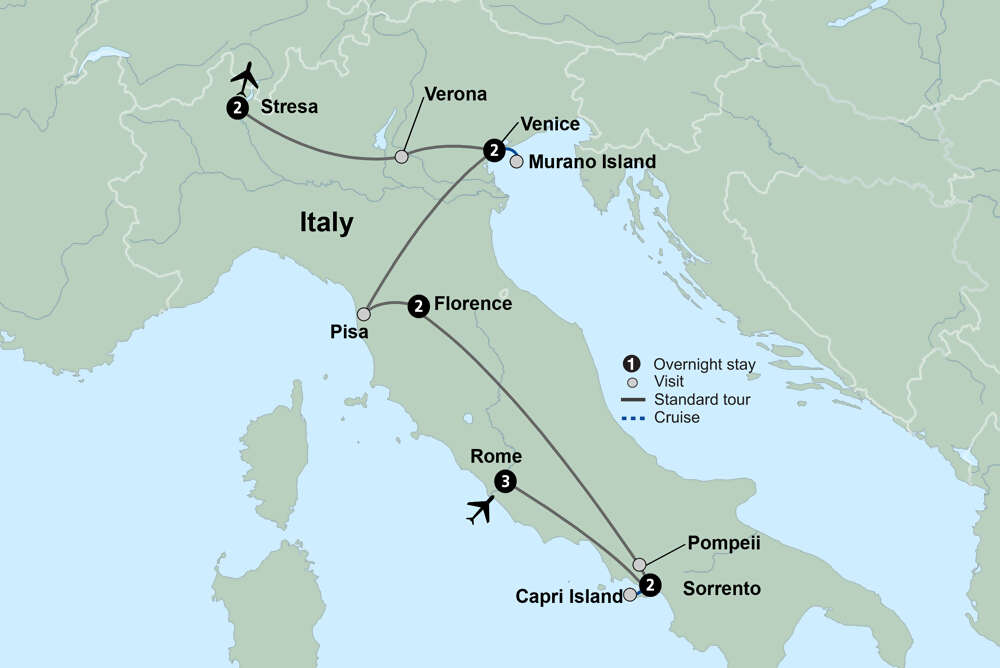 From the ancient ruins of Pompeii to the chic charm of the Isle of Capri, embark on a spectacular Italian getaway. Enjoy multiple-night stays in Rome, the charming Sorrento Coast, Florence, Venice, and Stresa in the Lake District. Discover the treasures of Classical Rome, including the Colosseum. Walk in the footsteps of the ancient Romans in Pompeii. Take a boat to the enchanting Isle of Capri. See the gems of the Renaissance in Florence, a veritable open-air museum. Marvel at the Leaning Tower of Pisa and stroll the streets of Verona. Stop at a Tuscan winery and farm for a lunch of regional specialties and wines. Tour Venice and walk the Castello district. Cruise to Isola Pescatori, one of the scenic Borromean Islands. Delve deeper into its history and culture as you visit some of the world’s most beautiful locales.