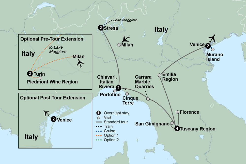 Vineyards, olive groves, and cities that float. Incredible history, indelible culture, and unforgettable cuisine. This is l’Italia at its most iconic. Enjoy the natural beauty and calm of the Alpine lakes region. Snake along the edge of the sea to the colorful villages of Cinque Terre. Aboard off-road vehicles, explore the marble quarries of Carrara, where Michelangelo obtained the marble for his statue of David. Relax during a leisurely 4-night stay at a Tuscan villa. At a family-owned villa, learn the fine art of creating Tuscan cuisine during a hands-on cooking class. Explore Florence, the birthplace of the Renaissance. Discover Venice, a city of winding canals and bridges. From medieval masterpieces to bustling piazzas, be swept away by the legendary treasures of northern Italy.
