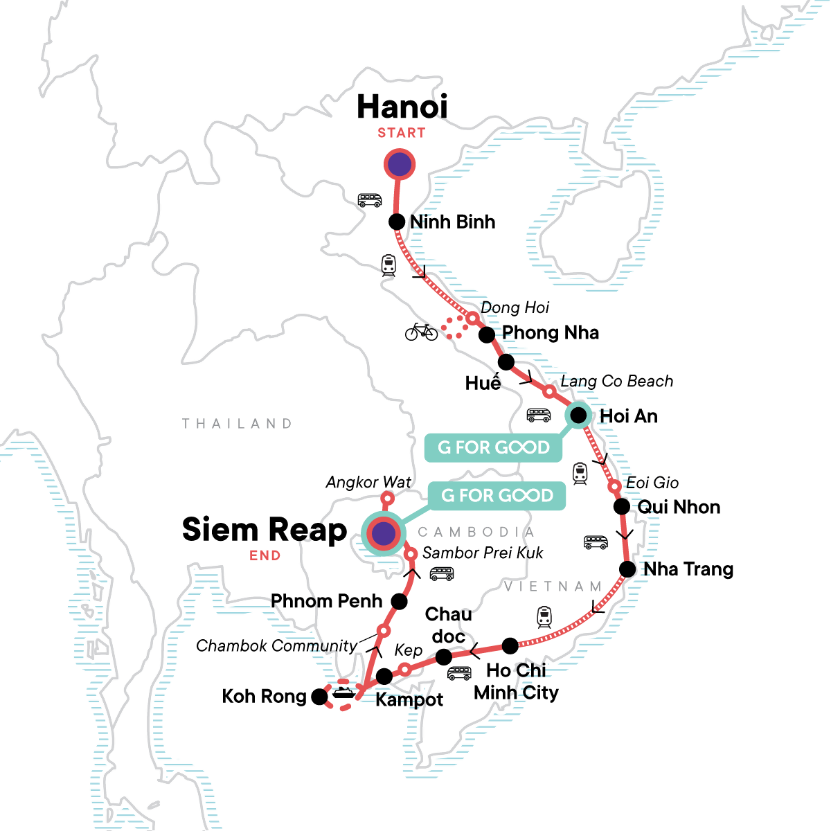 Your Foodie Moment: Ho Chi Minh City Street Food Crawl, Ho Chi Minh City. Hanoi Foodie Culture Tour. Tam Chuc Pagoda Tour. Dong Hoi Wet/Fish Market & countryside cycling. Vinh Moc Tunnels Visit. An Bang Cemetery Tour. Hai Van Pass & Marble Mountain Tour. Hoi An Old Town Walk and Riverside Evening Out. Thap Doi Cham Temples Visit. Eoi Gio Coastal Walk. Visit Gành Đá Dĩa. Nha Trang Mud Bath Visit. Ho Chi Minh City Walking Tour including Ben Thanh Market. Karaoke Night in Ho Chi Minh City. Street food crawl in Ho Chi Minh City. Sam Mountain Excursion by Motorbike. Sunrise boat trip in Châu Đốc. Kep Market Visit with Lunch (Cambodia). Monivong Bokor National Park Visit (Kampot). Ferry boat from Sihanouville to Koh Rong and back. Chambok Community Visit and Lunch. Cyclo ride around Phnom Penh in evening + dinner at a good local restaurant. Visits to Skun Market and Santuk Silk Farm. Tour of Sambor Prei Kuk Anicent Site. Visit Rong Klua Market. All transport between destinations and to/from included activities.