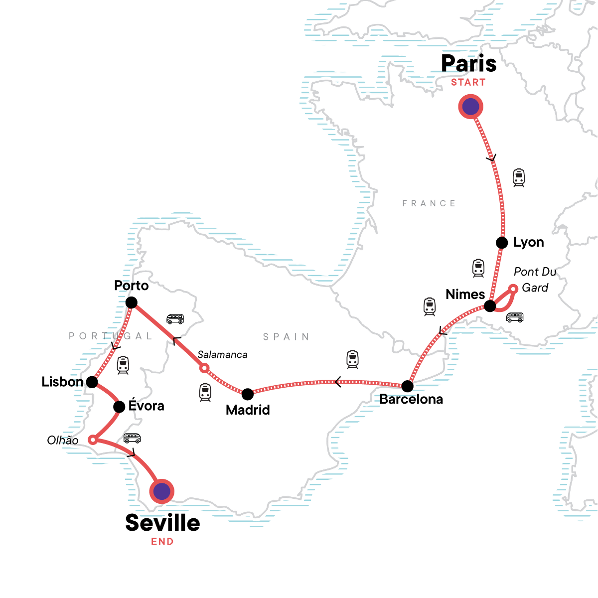 Your Hands-On Moment: Port Wine Cellar Visit, Porto. Paris-by-night orientation walk. CEO-led walking tour of Paris. Lyon walking tour. 48-hour Lyon metro card. Guided walking tour of Nîmes' Old City and Amphitheatre visit. Visit Pont Du Gard. Guided walking tour of Barcelona. 24-hour Barcelona metro ticket. Orientation walks in Porto, Lisbon and Seville. Chapel of Bones Visit in Évora. Flamenco Show in Seville. All transport between destinations and to/from included activities.