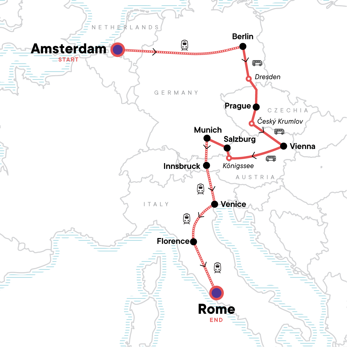 Your Foodie Moment: Florence Market and Food Tour, Florence. Cruise around the canals on a Bike tour in Amsterdam. Take a hike along a lake near Salzburg. Sample local brews with a beer tasting in Prague. Hike in the Italian alps along Lake Misurina. Explore Vienna on a walking tour. Learn of the local legends on a ghost tour in Venice. Try local delicacies on a market and food tour in Venice. Sample delicious local food in Florence and Rome. Free time in major cities throughout adventure. Transportation between all destinations. 24 hour metro pass in select cities.
