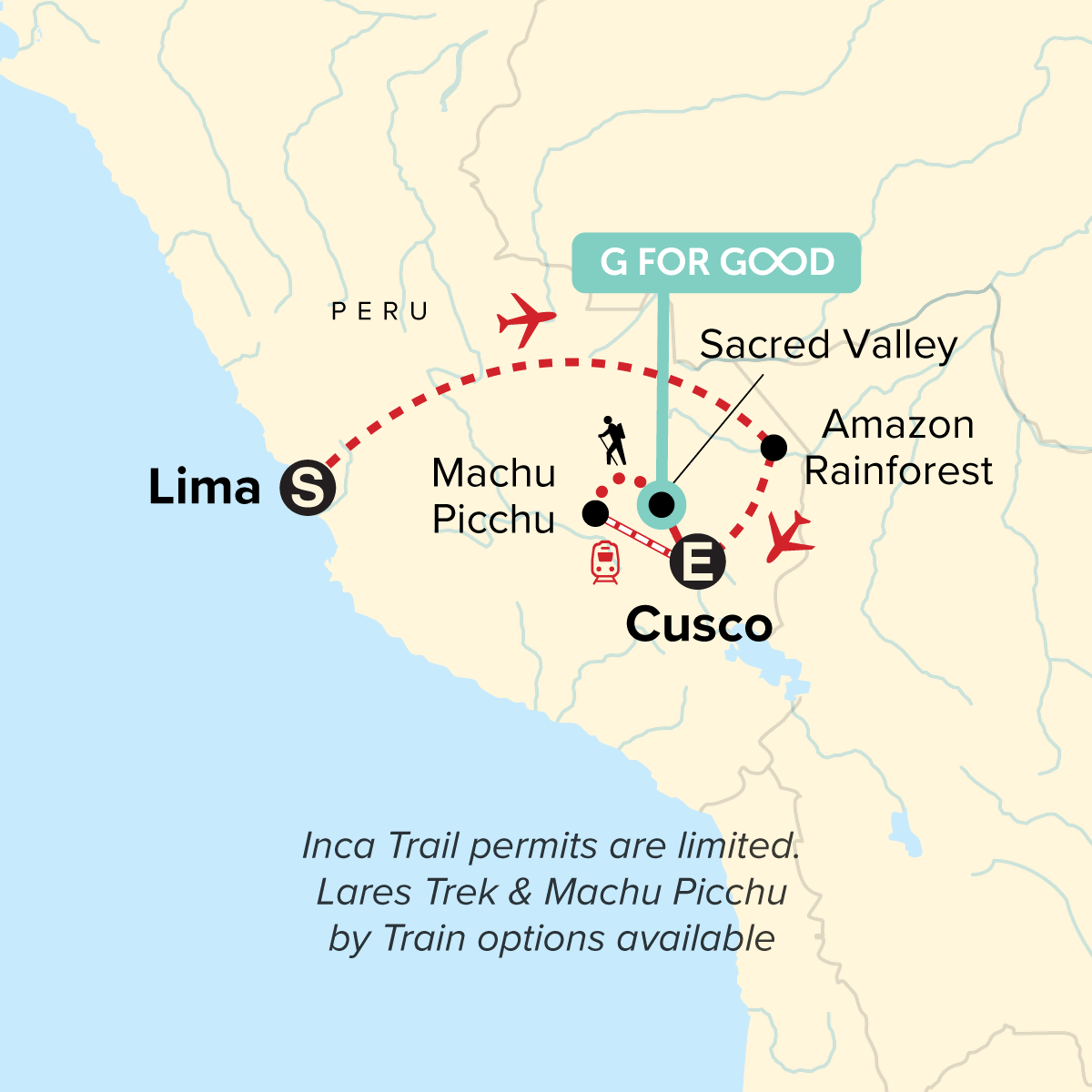 Your G for Good Moment: Handmade Biodegradable Soap Products. Arrival transfer. Three-day (2 nts) excursion to the G Adventures intimate rainforest lodge. Sacred Valley tour. Choice of four-day Inca Trail hike with local guide, cook, and porters or Cusco/Aguas Calientes stay with scenic train. Guided tour of Machu Picchu. Internal flights. All transport between destinations and to/from included activities