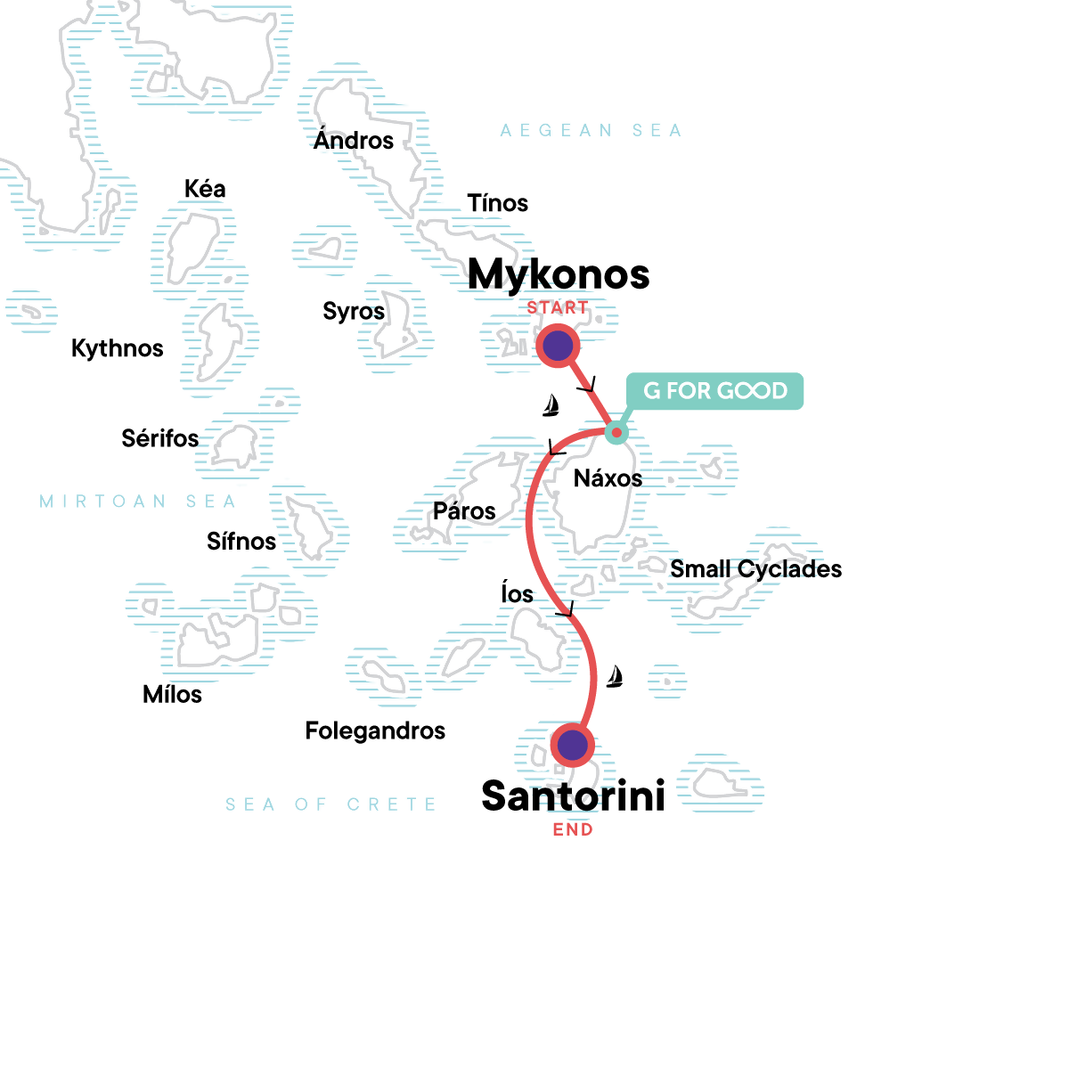 Possible island stops include: Naxos, Paros, Antiparos, Ios, Sifnos, Folegandros. The order of stops over the next few days will be weather dependent.