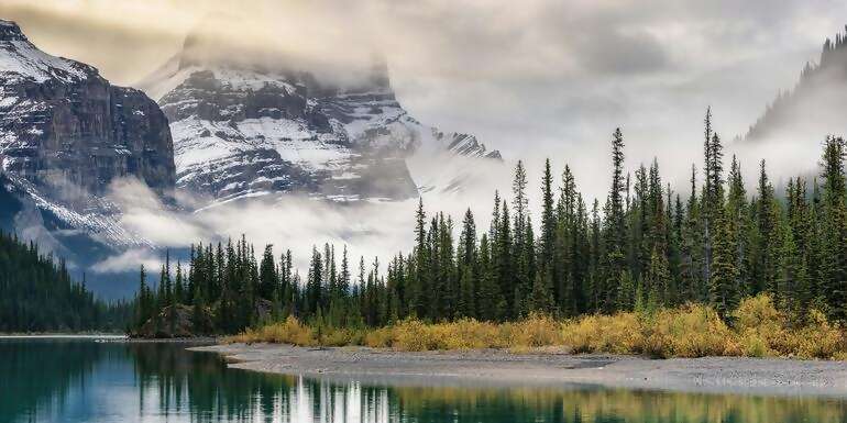 Leave the wide-open prairies behind as the horizon begins to ripple with the jagged silhouettes of the Rocky Mountains — a transition that feels almost cinematic, the landscape shifting mile by mile from golden grassland to alpine wilderness. Follow the winding paths of fur traders past, pausing for lunch as the air grows cooler and the trees taller. Visit Jasper House, a National Historic Site that once served as the beating centre of mountain trade. After settling into your lodge, join your Expedition Leader for a gentle stroll around the turquoise waters of Beauvert Lake, the reflection of the peaks on the glass-like surface providing a quietly perfect introduction to Jasper National Park.