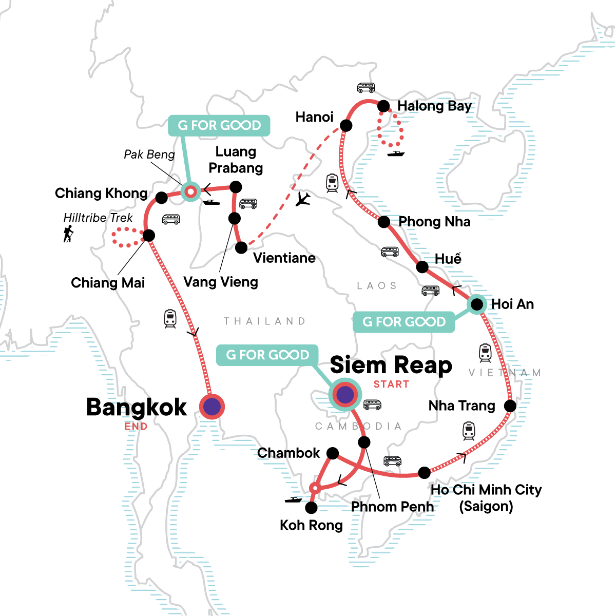 Your Discover Moment: Chiang Mai. Guided sunrise tour of Angkor Wat temple complex. Traditional meal at the G Adventures-supported New Hope project or in a local home in a nearby village. Local living moment at Chambok Homestay including dinner. Orientation walks in Phnom Penh, Ho Chi Minh City, Hoi An, Hanoi, and Luang Prabang. Street food crawl in Phnom Penh, Nha Trang, Luang Prabang. Noodle-making demonstration and lunch at Oodles of Noodles (Hoi An). Halong Bay boat cruise with lunch. Hilltribe trek in Northern Thailand, including bamboo rafting. All transport between destinations and to/from included activities.