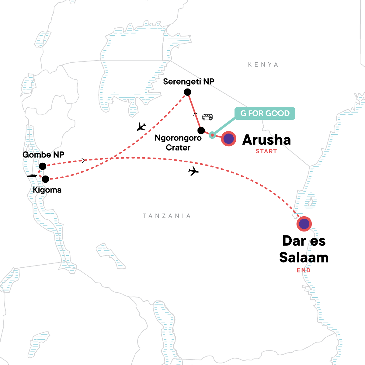 Ngorongoro Crater safari, Cooking demonstration and lunch at Mto wa Mbu, Serengeti safari drives, Chimp Trekking in Gombe Stream National Park, Visit Dr. Jane Goodall's former home and research station, Hike to Jane's Peak
