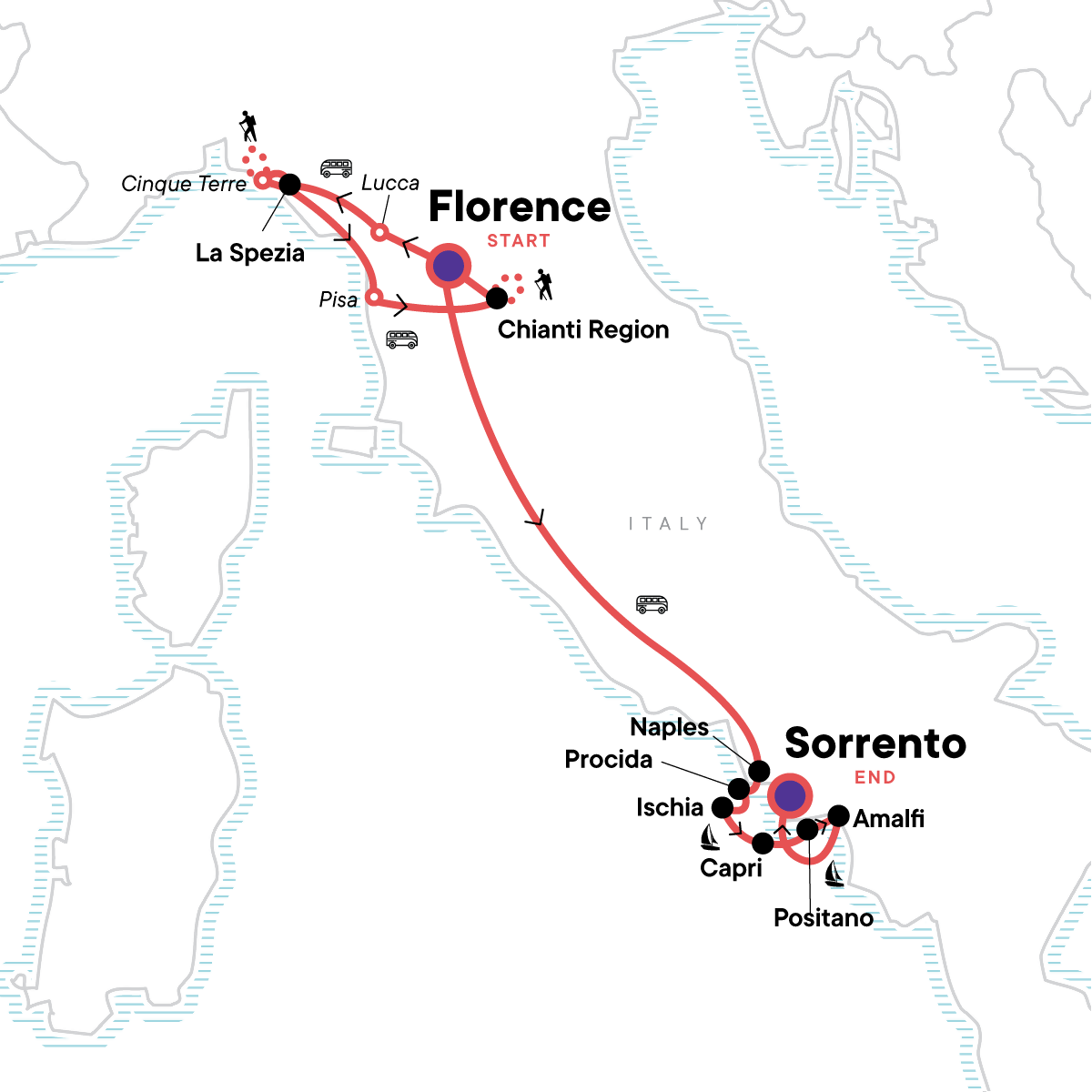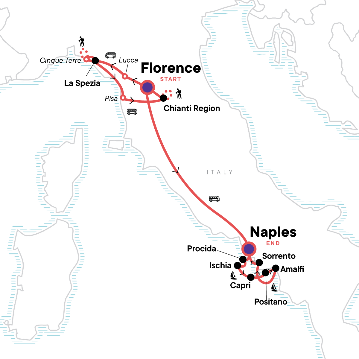 Take a guided walking tour through the art-filled streets of Florence, Hike the dramatic coastal trails of Cinque Terre, Snap a photo with the iconic leaning tower of Pisa, Spend two nights soaking up the beauty of the Tuscan countryside, Explore the cliffside charm of Capri and Positano, Sail the turquoise waters of the Tyrrhenian Sea past volcanic coastlines