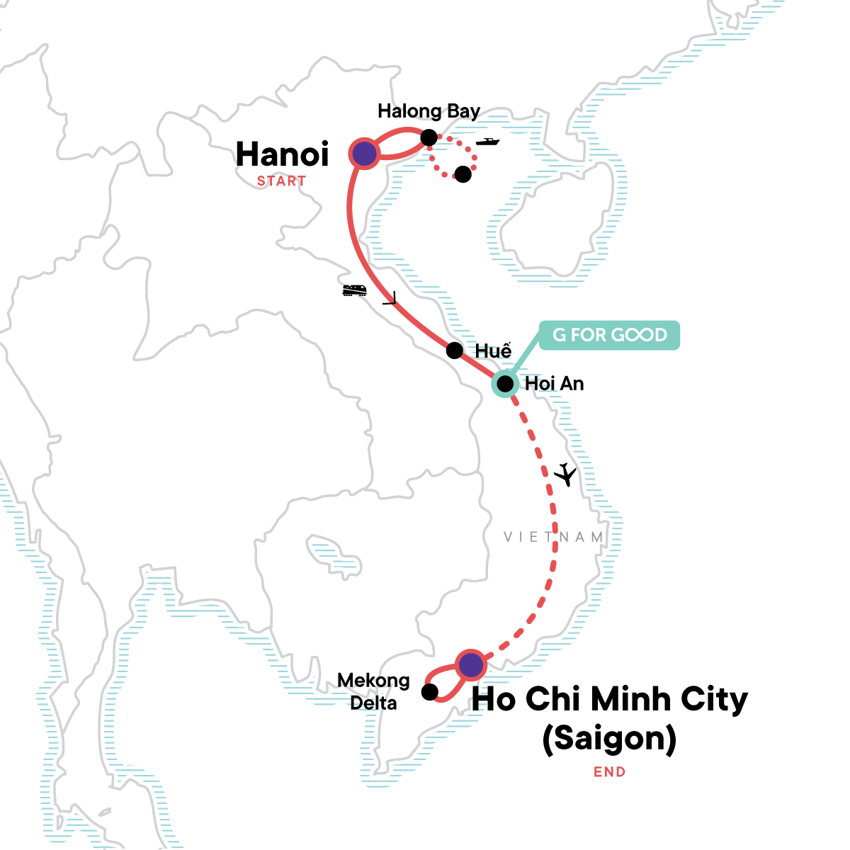 Your Local Living Moment: Mekong Homestay, Mekong Delta. Arrival transfer. Cyclo tour through Old Quarter (Hanoi). Water puppets show. Halong Bay boat trip. Citadel tour in Hue. City cyclo tour in Hanoi and Ho Chi Minh City. Mekong Delta boat trip.